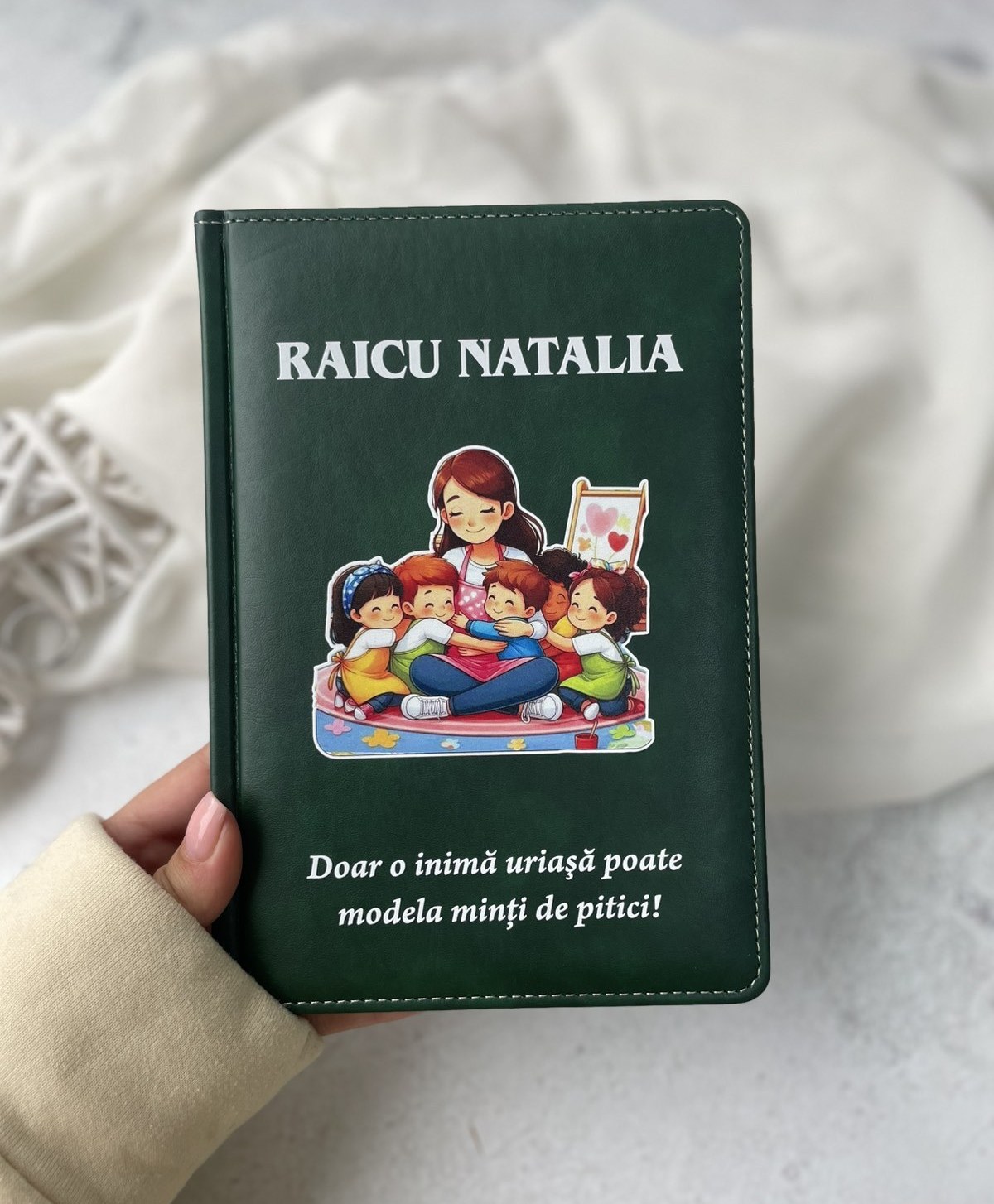 Fiecare piesă poate fi personalizată cu text, nume sau mesaj, fiind perfectă pentru educatoare, profesori sau persoane dragi.