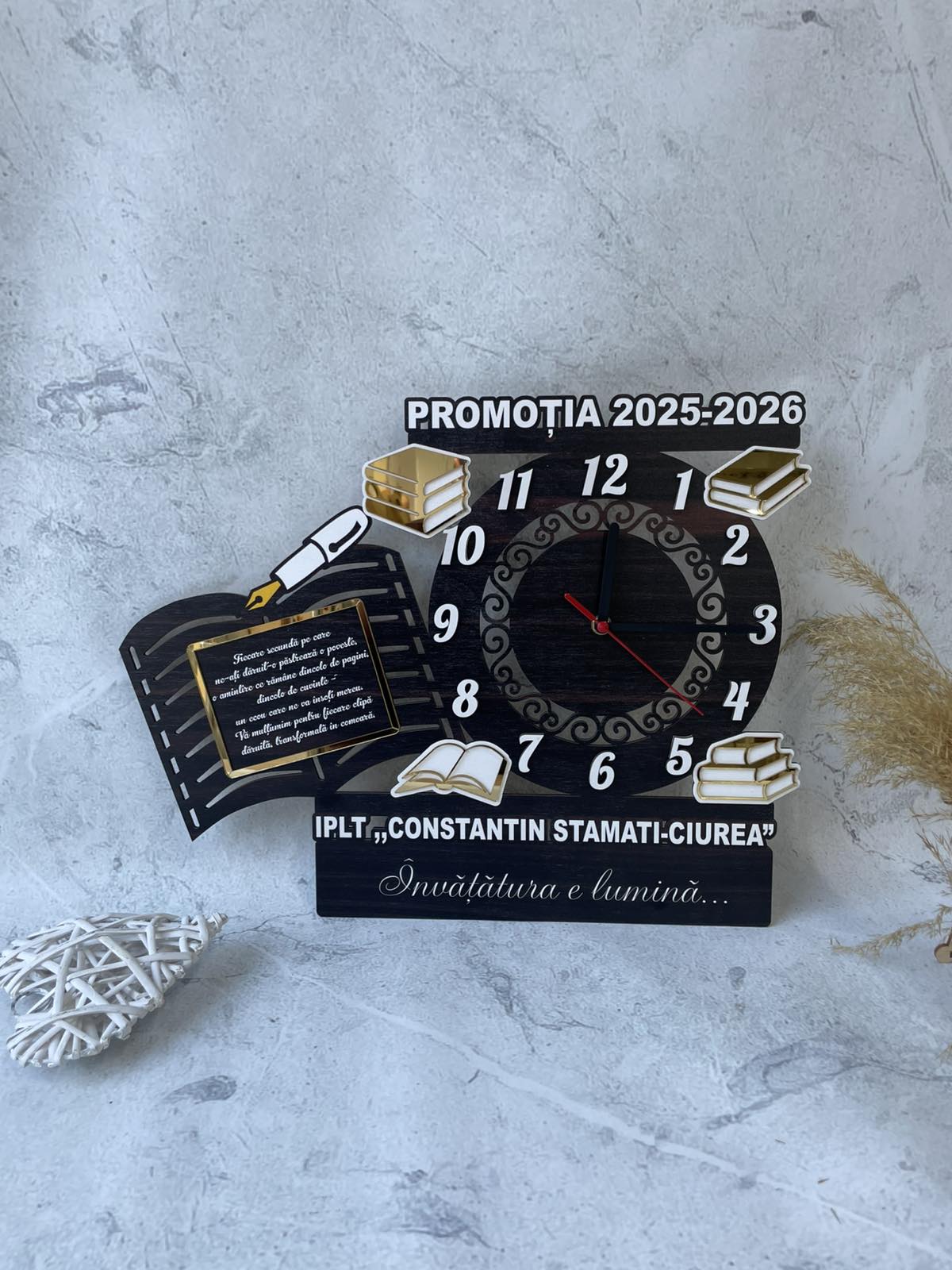 Fiecare ceas este cu mesaje de apreciere, nume sau simboluri educative, devenind un cadou unic pentru sfârșit de an școlar, festivități sau „Ziua Profesorului”.