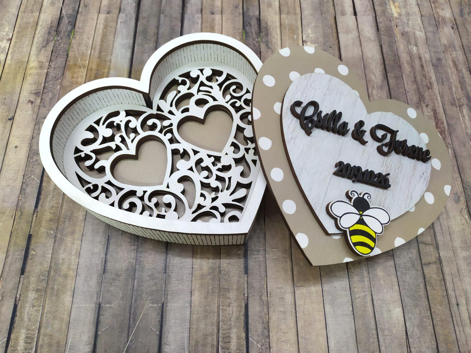 Cutiile pentru verighete sunt realizate din lemn și pot fi personalizate cu nume, inițiale sau mesaje speciale.