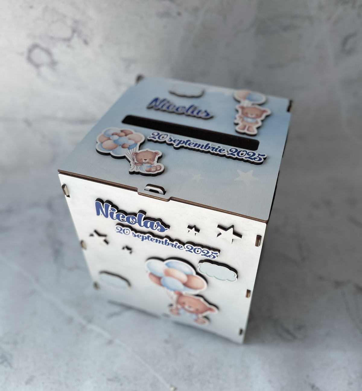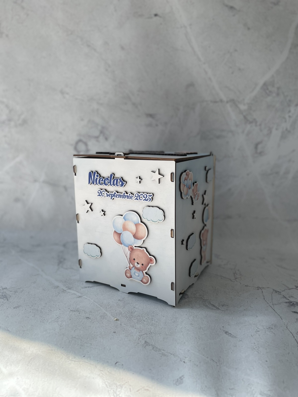 La TG Decor îți oferim cutii pentru bani botez realizate din lemn, acril sau carton, cu designuri jucăușe și detalii personalizate. Fie că organizezi un botez cu tematică clasică sau modernă, cutiile noastre sunt soluția ideală pentru a strânge darurile într-un mod sigur și estetic.